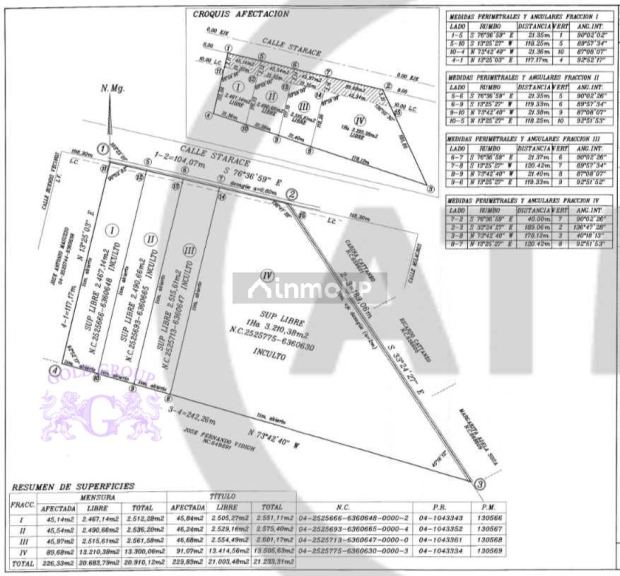 Los lotes ( tres disponibles, reiteramos ) son los siguientes: I ( de 2.467 m2, con 21,36 mts de frente ), II ( de 2.490 m2, con 21,38 mts frontales ) y el 3 ( de 2.271 m2, con 20,93 mts de frente ).